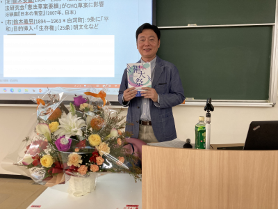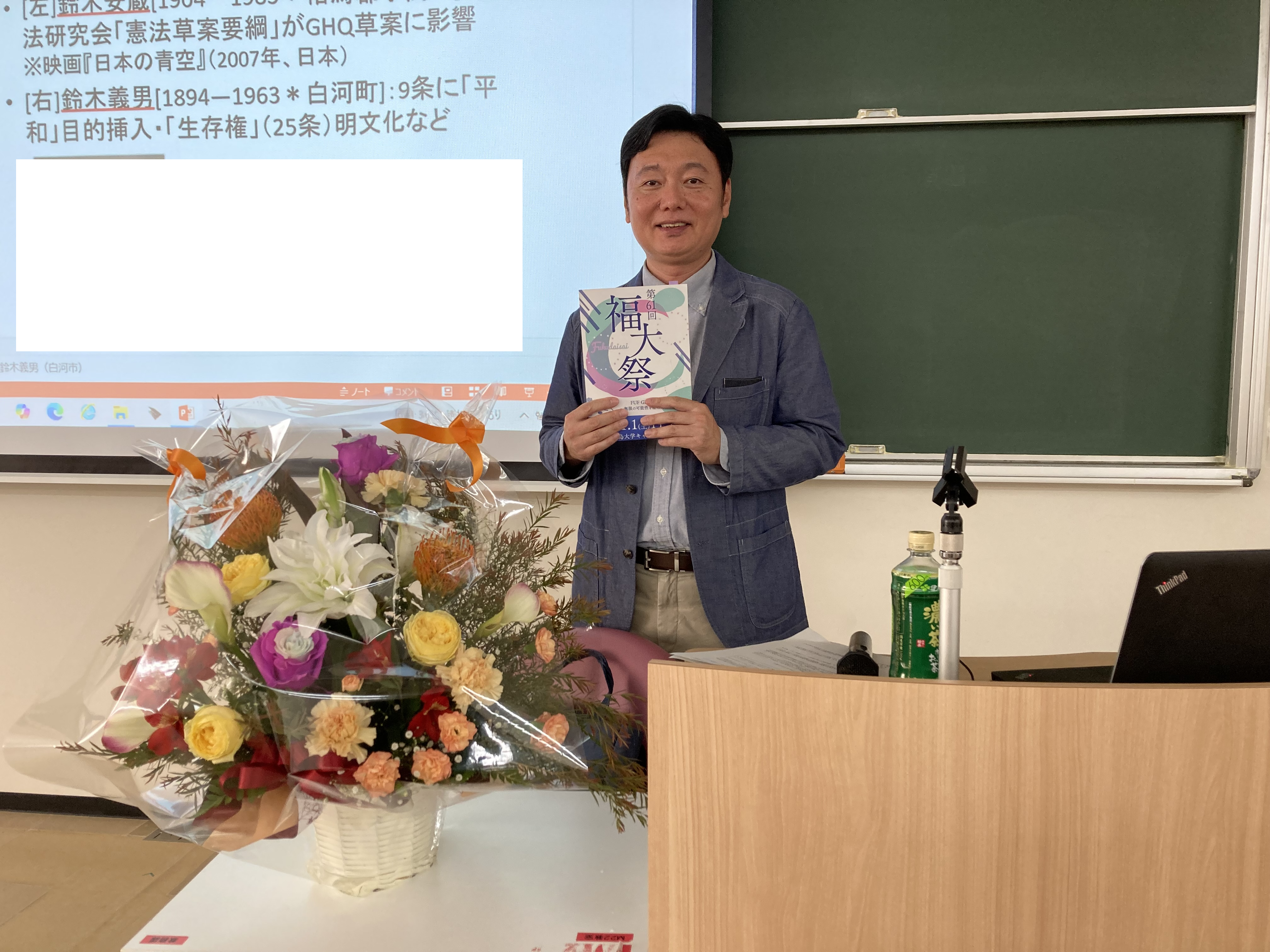 福大祭においては、行政政策学類の金井光生教授の講演会「日本国憲法を生んだ福島の偉人」も開催されました。民間憲法草案「憲法草案要綱」を起草し、GHQ草案に大きな影響を及ぼしたとされる、現・南相馬市出身の鈴木安蔵、衆議院の帝国憲法改正小委員会(芦田小委員会)のメンバーとして憲法改正に関与した、現・白河市出身の鈴木義男らの業績と思想が紹介され、聴衆の皆さんの大きな関心を呼びました。
