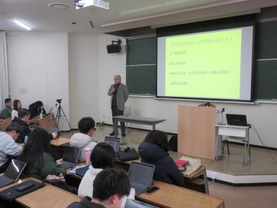 最終講義は地域福祉論の今年度最終回となる講義を公開するかたちで行われました。講義の受講者に加え、卒業生、教職員の姿も多数、ありました。鈴木教授の人柄が伝わる、大変印象に残る講義でした。